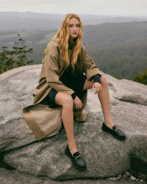 a lightweight chunky loafer crafted from smooth cow leather, featuring classic penny loafer detailing with an almond toe and trim accents. Finished with old gold hardware and an EVA rubber outsole, perfect for any staple wardrobe.